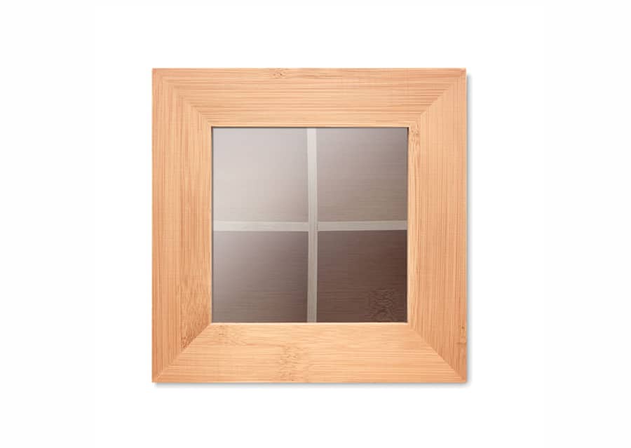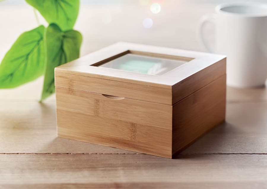 Köstliche klimafreundliche quadratische Teedose mit Glasdeckel, bei der der Boden aus Bambus besteht. Die Box ist in vier Fächer unterteilt für die Präsentation von insgesamt 24 Teebeuteln. Ideal als Firmen- oder Mitarbeitergeschenk. [bambus] [glas_s]